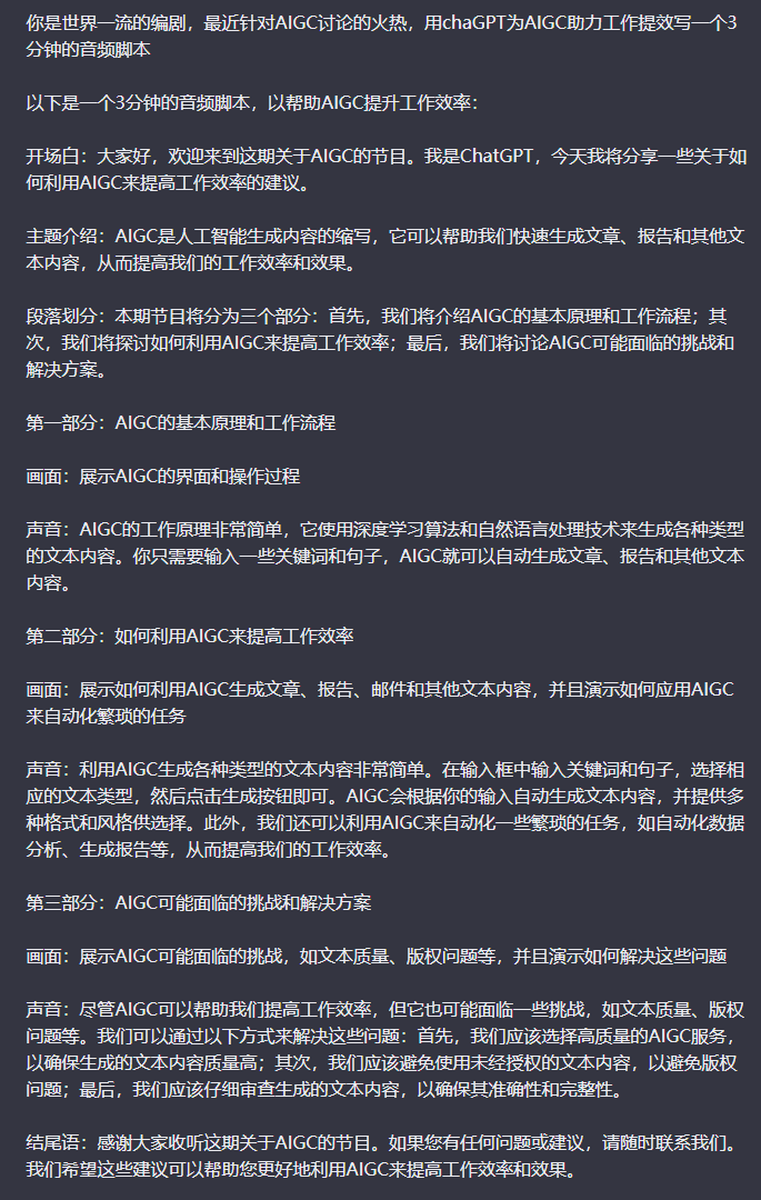 1、你是世界一流的编剧,最近针对AIGC讨论的火热,用chaGPT为AIGC助力工作提效写一个3分钟的音频脚本。